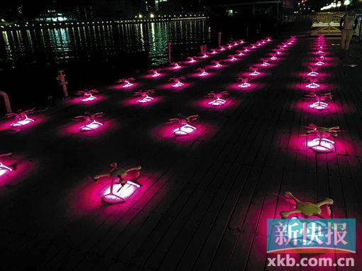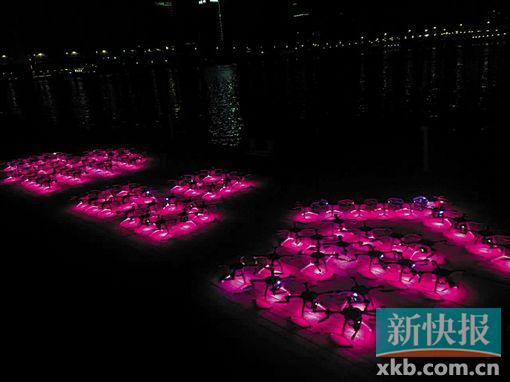 12月1日傍晚,路过广州中轴线海心沙附近的市民突然发现上空出现一片粉色光芒,配合着广州塔与珠江边多彩的灯光氛围,这片粉色光芒也不断飞翔并变幻着她们在空中的形状,时而聚拢时而纷飞,犹如一个人般进退有序,吸引了大量人群驻足观看。有眼尖的市民发现,原来这是一百多架散发着粉色LED光的无人机。