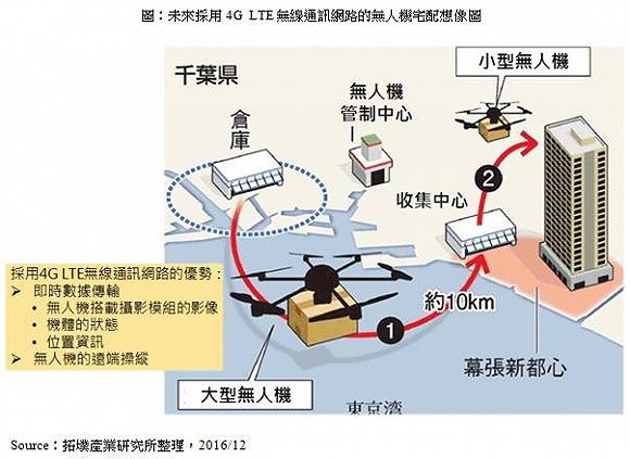 以日本送货无人机企业为例,在已经准许使用的空域上进行视距外遥控送货无人机过程中,除了内置的GPS定位装置发送其位置资讯外,操控者可透过装置在其无人机的摄影模组观察其四周与地面、海面上的情况,也可透过其操控系统平台上观察其旗下的其他多架无人机飞航路线、高度及完成送货等细节资讯。