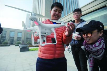 无人机飞手亮相结束后,伴随着一阵螺旋桨的“嗡嗡”声,三架小型无人机腾空而起,它们摆着不同的造型,在空中完成各种回旋和斜拉,引起阵阵欢呼。记者了解到,操作这三架无人机的选手都是来自青岛电子学校的高中生。带头的是16岁的曾呈祥,别看年龄小,他已经是航模界的“老手”,在初中时还担任课外兴趣小组的老师,教授大家航模制作和飞行技术。在升入电子学校后,在操作无人机航拍学校时认识了同样爱好无人机的同学张修鹏和王本峰,自此三人经常练习高难度的编队飞行。得知第二届无人机摄影大赛召开,他们决定到场“露一手”。
