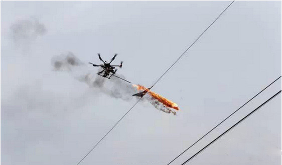 地面操作人员按下喷火按钮,停在高压线上方的无人机喷出一股火焰,高压线上的异物被瞬间点燃,化为灰烬。这一幕发生在2日,襄阳供电公司检修分公司带电作业班,利用无人机处理高压电力线路缺陷,首次试验并成功。