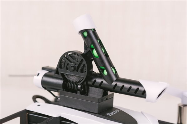 Mambo的机载机炮直接安装在机身的上方,炮管和弹药槽成枝桠状,发射管平行于机身,弹药槽与水平线呈60°角。Mambo的机炮使用BB弹作为弹药,最大载弹量为6发,弹药槽装填是单向的,也就是说塞进去后,只能从炮管里射出,装填口的设计卡住了BB弹使它不会倒出来。至于BB弹这种我们经常在玩具枪里见到的塑料小球粒给Mambo来射几乎没杀伤力,对人来说其实很安全,只要不刻意近距离对着眼睛这样的地方发射,不小心打在人身上这种情况是不要紧的——前提条件是你打得中。