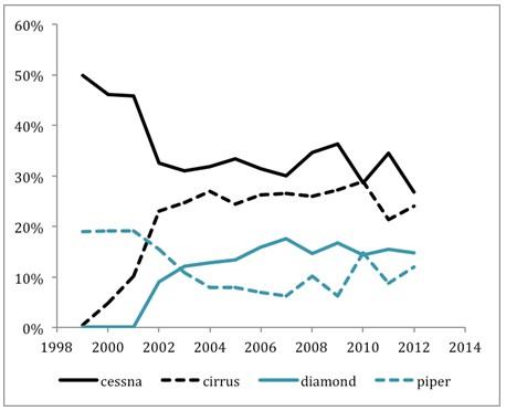 2011年,中航通飞率先出手,收购了全球第二大通用飞机制造企业,美国西锐设计公司(Cirrus Design)。资料显示,活塞发动机飞机的四大制造商包括:赛斯纳(Cessna)、西锐(Cirrus)、钻石(Diamond),和派珀(Piper)(见下图1)。西锐以24%的市场份额,成为仅次于美国赛斯纳飞机公司(市场份额27%)的全球第二大通用飞机制造企业,成立于1984年,目前其产品已经发展到第五代单发活塞式飞机SR22系列,连续五年在同级别机型中销量最大。中国通飞出手不凡,首先从飞机设计高端切入了世界通用航空产业链。