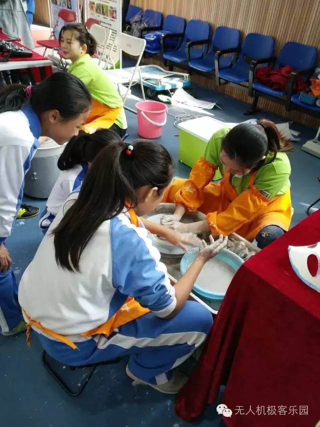回到活动现场,吸引小朋友驻足观看体验的都是能展示他们天马行空的想象以及动手能力,例如陶瓷、绘画、无人机体验、手工作品等等都好不热闹,尤其在无人机模拟器室前,一批接一批的孩子乐此不疲的操控着无人机自由飞行,虽没有真机体验那么紧张刺激,但那种趣味也是难以抵挡的。