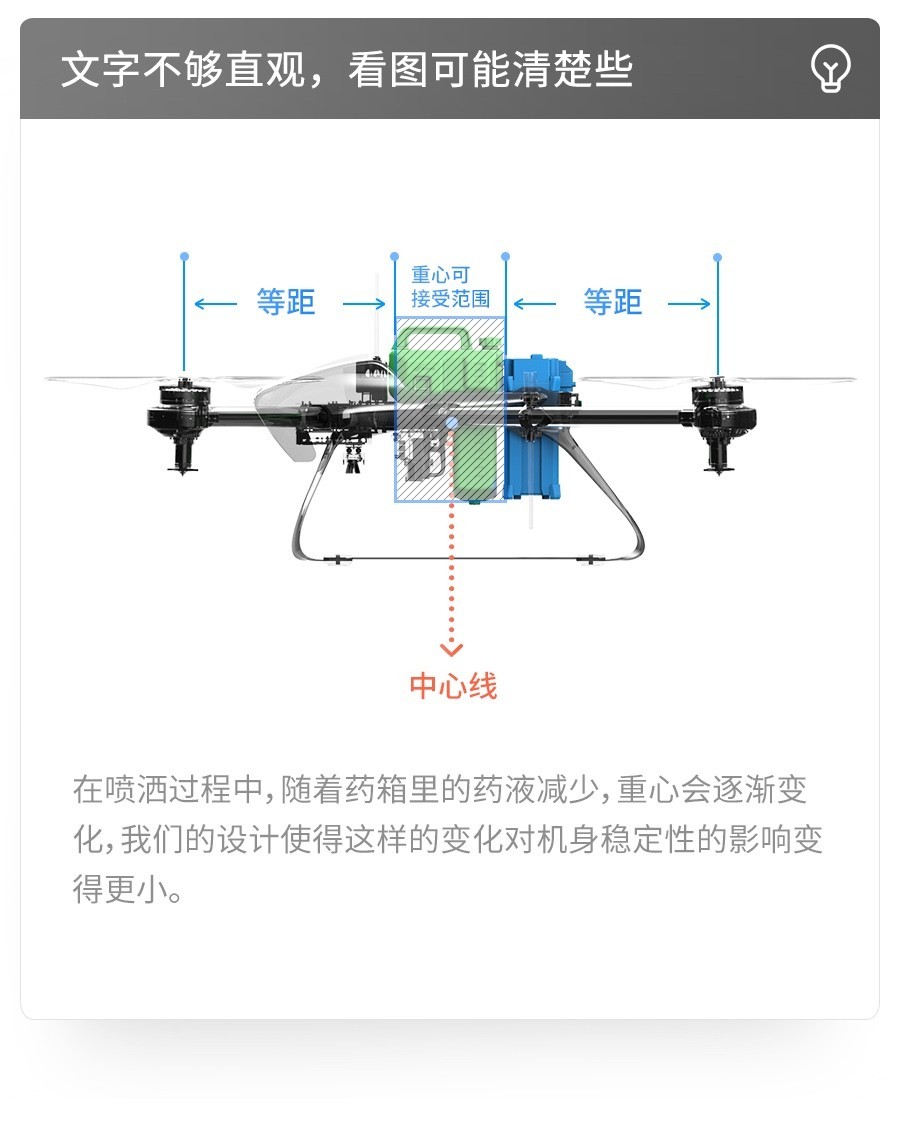 理论上,装满药的药箱和电池是整个飞机结构里最重的部分,都需要放在整个机架结构的中心位置。