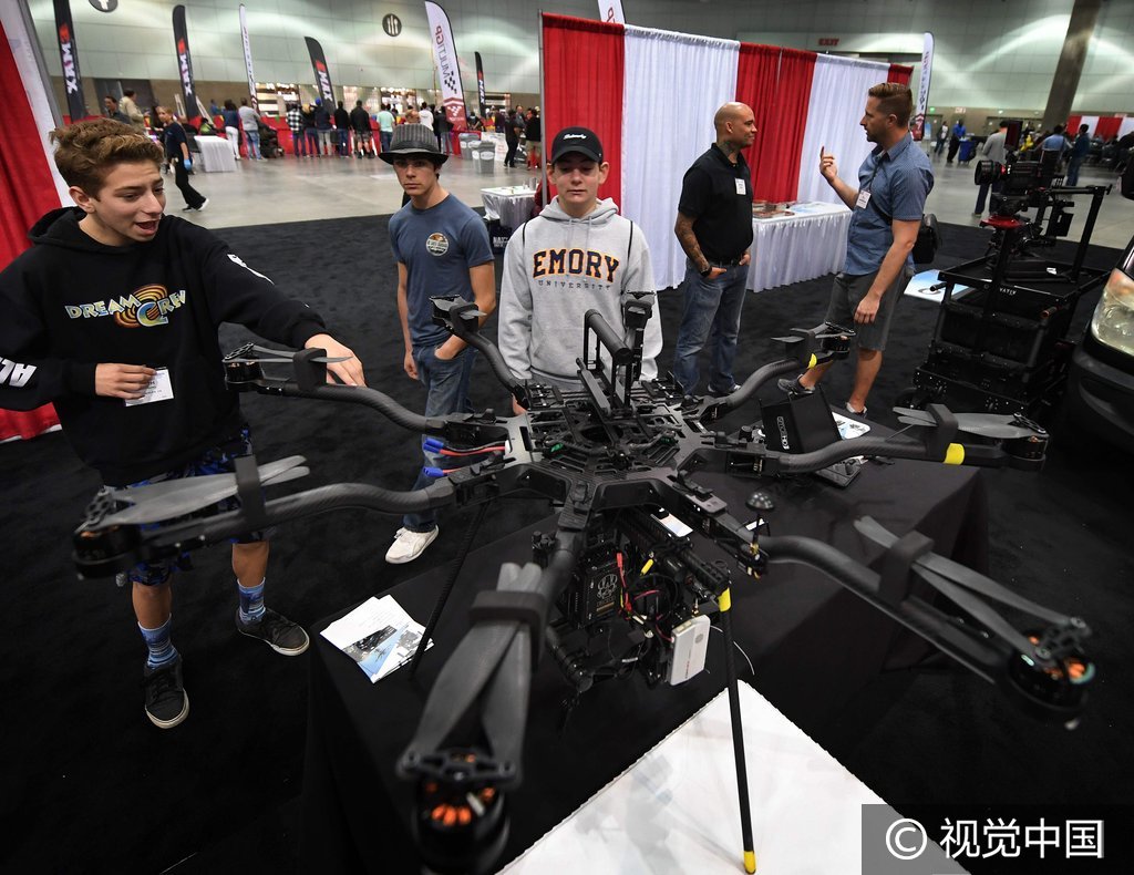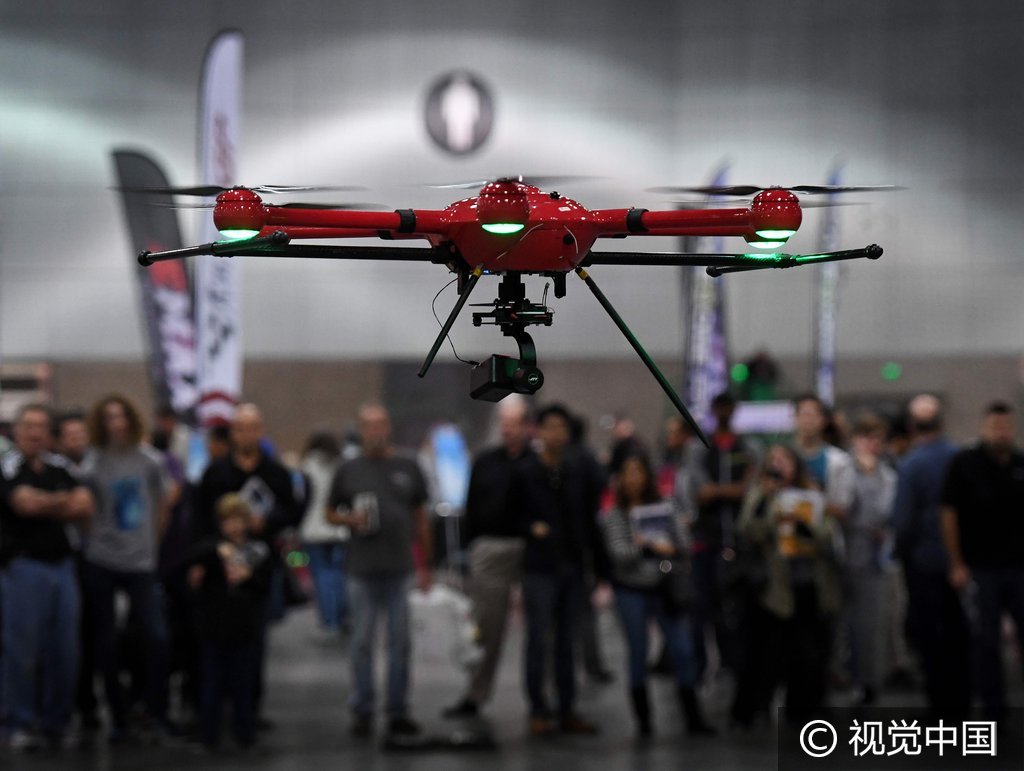 当地时间2016年12月10日,美国洛杉矶,国际无人机展览会举行,深圳一家公司制造的飞行器亮相。