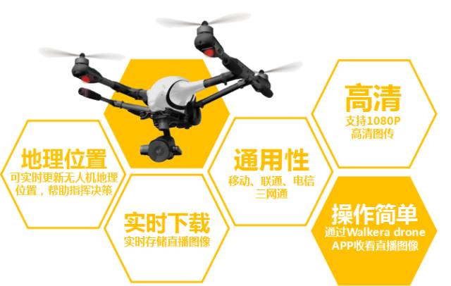 Voyager4无人机高清信号源通过4G网络,接入直播服务器,并通过移动网络与有线网络进行分发。用户可以通过接入互联网的移动设备、电脑等终端,方便地实时收看高清的直播图像。在高速宽带的支持下,可实现高清1080P图传、实时下载直播图像、实时更新地理位置等功能。并通用国内三大运营商的4G网络。