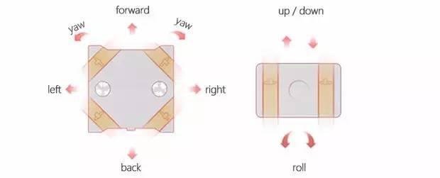 它能绕 5 个不同的轴方向进行旋转,并做出前进 / 后退、向左 / 向右、向上 / 向下、偏航 / 翻滚的动作,或在水下保持相对静止,这给我们提供了最佳的水下遥控拍摄体验。