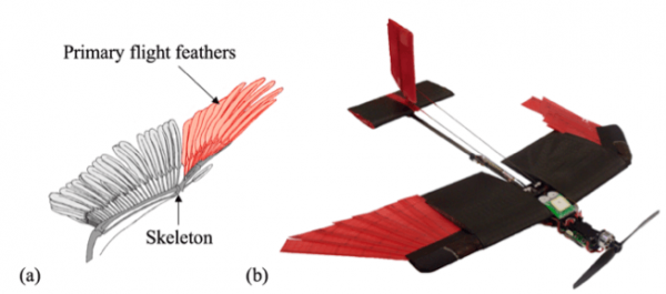 研究人员表示,这架无人机在飞到障碍物之间时,可以调整其“翅膀”的形状,并能完成急转弯及经受住强风的考验。 他们构建了一个机制,允许这个大型的人工羽毛能够被固定在机翼上。这些人工羽毛由玻璃纤维和尼龙薄层制成。