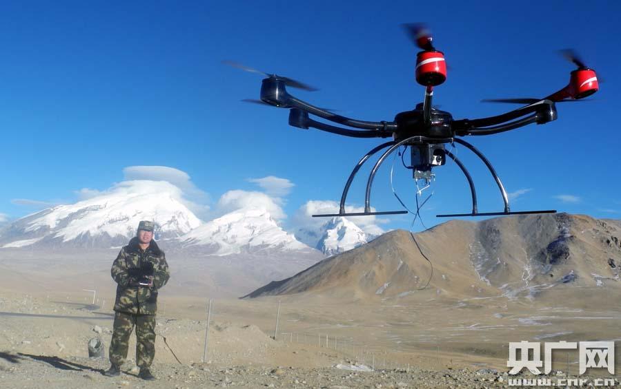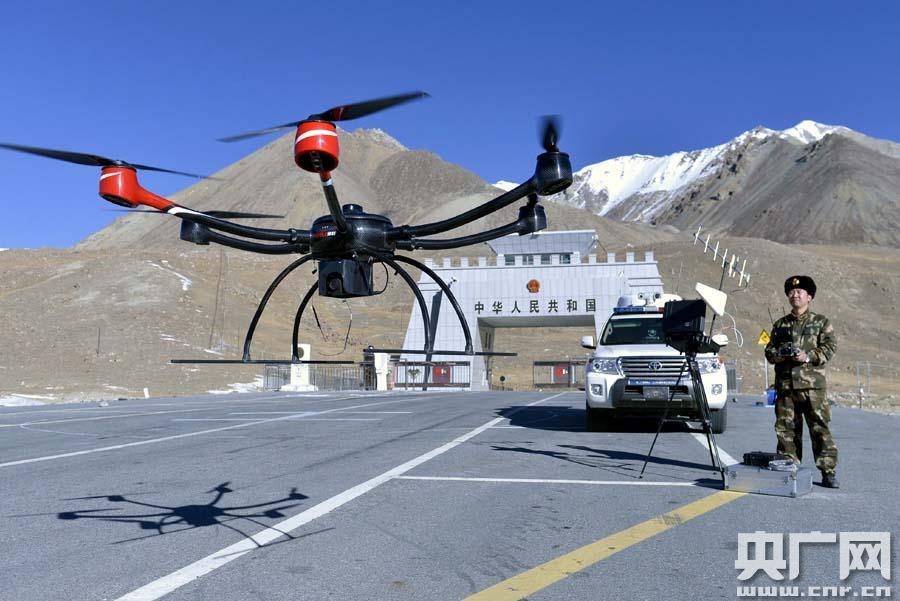 边防官兵操纵无人机起飞昨天,武警新疆边防总队机动支队官兵利用无人机在海拔5100多米的帕米尔高原边境地区进行巡查。武警新..." />