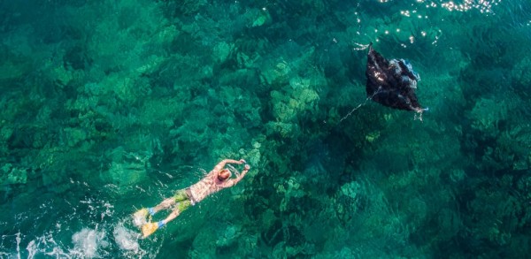 斐济亚萨瓦群岛一名潜水员正在追逐“魔鬼鱼”