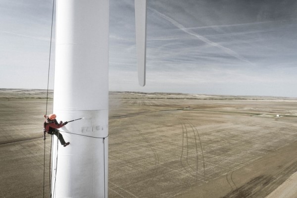 加拿大阿尔伯塔南部风力涡轮机上的一名正在工作的工人