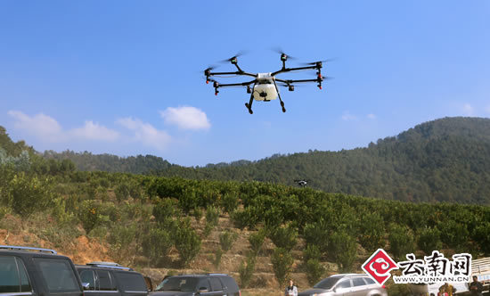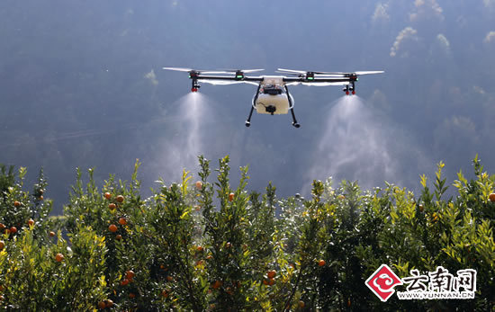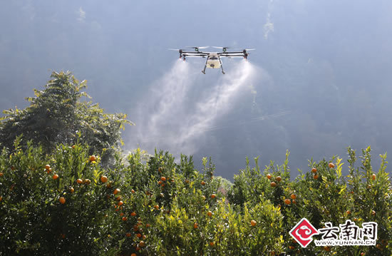 在华坪县船房乡嘎佐村深山柑橘种植专业合作社果园基地,丽江杭瑞农业综合开发有限公司董事长王东的操作下,无人机携带10公斤农药起飞到柑橘林间轻松均匀的喷洒着农药,不停变换着速度与方向。植保无人机产生的下压气流将农药高度雾化,均匀地喷洒在农作物茎叶、背面和根部上,在农作物上方一米左右的高度快速飞行,喷洒农药宽度约5米,10分钟就能完成10亩农田的喷药任务。
