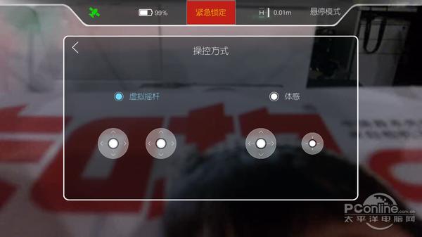 在操控方式上,基石KIMON提供了两种操控方式,包括传统遥控器的操控方式,以及在手机遥控无人机常见的体感遥控功能,根据手机的陀螺仪进行无人机的前后左右的飞行控制,让用户更深入的体会无人机的飞行情况。