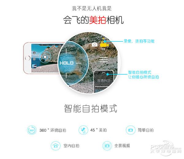 “45°美拍”,这是无人机集成了一系列的运算模式,自动往后上方飞行,从而从近到远再到近处的视频拍摄,可以拍摄自拍者在的周围环境,在以往的无人机当中,该项功能大多数是被需要手动控制无人机的飞行才能实现,如今简单的点击开启高功能,无人机就自动替你操控,相当方便。