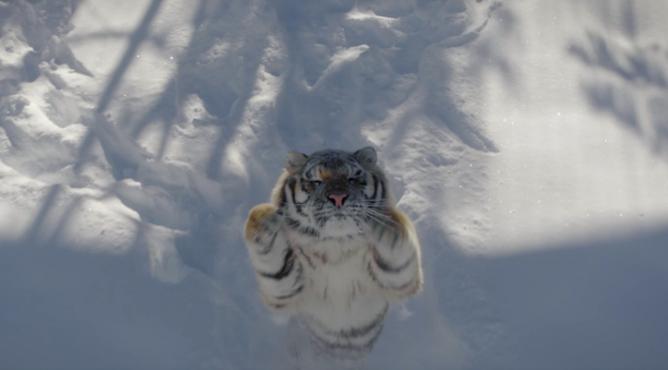 透过镜头,可以看到当时三只老虎正在雪中作息,但见到靠近的无人机便开始充满戒心,一直虎视眈眈,时而伏卧,时而趋近,最后更一度飞扑,但最终落空,对这位不速之客束手无策。