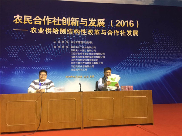 2016年12月20日-22日,《农民合作社创新与发展(2016)——农业供给侧结构性改革与合作社发展》年会在农业部干部管理学院召开,本次年会旨在推动我国农业供给侧结构性改革,把握“提质增效转方式、稳粮增收可持续”的工作主线,充分发挥合作社在推进我国农业转方式调结构中的功能作用,提升合作社带头人的素质和能力,增强现代合作社整体实力。来自江苏徐州的企业--江苏大成航空科技有限公司作为无人机行业唯一受邀代表参会,其4米轴距的“大成-10”型无人机亮相会场。