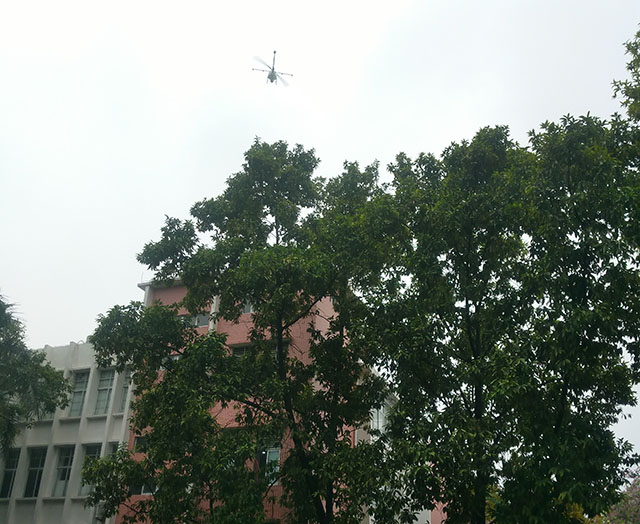 这次作业采用单旋翼的植保无人机,起飞风场大稳定,能够翻卷起树叶,将药液打到叶背面,穿透性强,适合高乔木或者果树等喷洒作业。无人机加满药后,在飞防队操作下就起飞了,因为树高,采用手动模式,跟近些,放缓飞行速度,让药液充分沉降至叶面、背面及树干上,虽然效率低些,效果确是最好的。