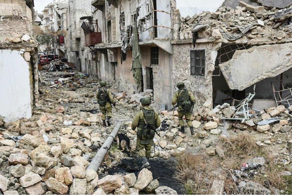 俄军排除阿勒颇住宅区的简易炮弹和手榴弹现场