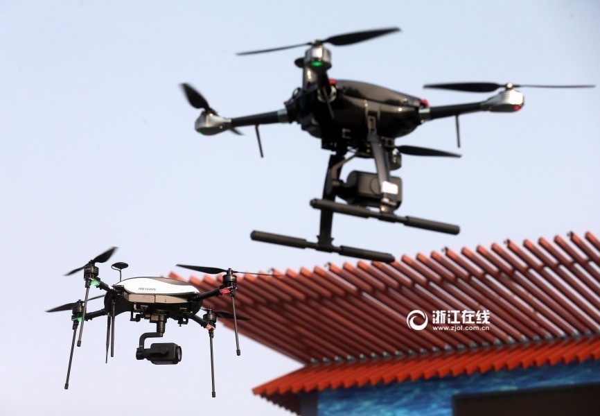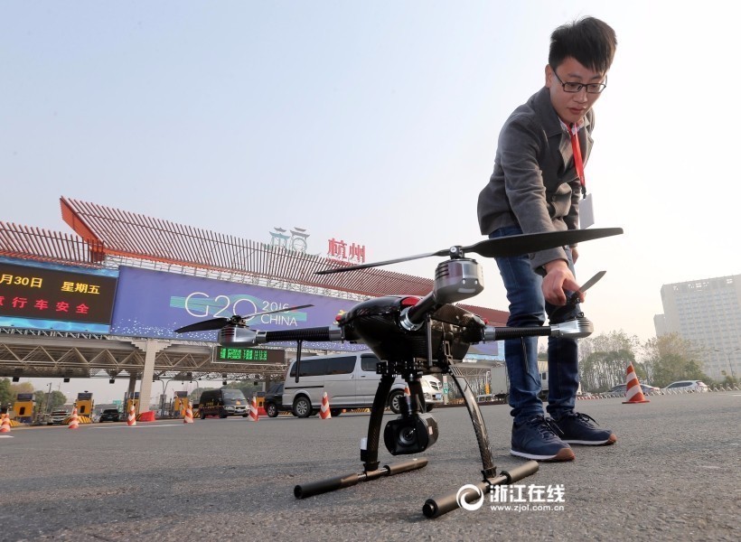 昨天下午2点半,杭城天气晴朗,能见度高。在杭甬高速彭埠收费站外广场上,停着两架无人机。一架通体黑色,一架银黑相间,均为四旋翼飞机,像是两只等风的鹰。