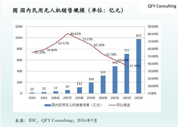 大疆的成功证明消费级无人机是一个不错的市场,但这并不是一个巨大的风口。根据IDC的数据,中国民用无人机市场规模在2016年为37亿元,2017年还将保持高速增长,有望达到62亿元,但在2018年之后,民用无人机市场的增速将会放缓。