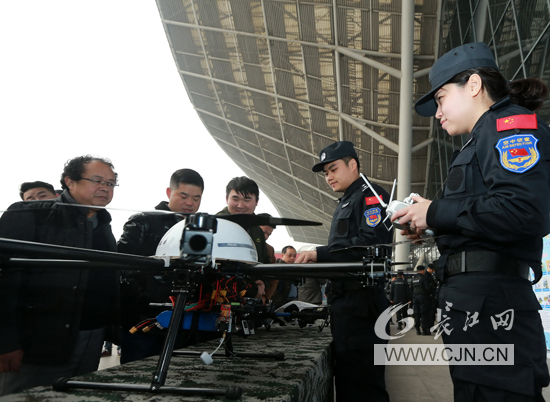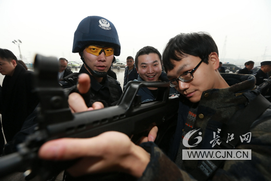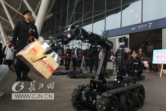 将活动推向高潮的是全副武装的铁路特警,他们向路过旅客展示和介绍警用装备。现场展出防暴服、排爆服、防弹盾牌、“85式”和“88式”狙击步枪、“79式”微型冲锋枪、95式突击步枪、“97-1”式毫米防暴枪、“92式”警用手枪、防割手套等。最后还亮出了排爆机器人,并进行现场实操。特警与旅客们积极互动,多名旅客亲身体验特警装备。来自江苏的旅客李先生兴奋的说:“警察蜀黍的突击步枪真给力,太帅了!”而去福建的王女士看到无人机和排爆机器人深有感触地谈到:“第一次近距离接触到公安同志的高科技设备,看到他们应用于实战中,让我们感受到了满满的安全感!”