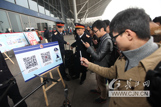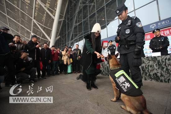 上午,在武汉火车站东进站口,治安、安检、消防等部门民警向旅客们介绍了铁路安全知识、禁止携带进站上车“危险品”常识及消防安全知识等;刑侦部门多名反扒、破案能手详细介绍旅途中易被盗、被扒、被骗、被坑等情形,提醒旅客提高防范意识和能力。随后,武汉铁路公安处警犬大队的民警携1岁的警犬“野马”亮相,并与过往旅客进行亲密互动,几名过往的大学生和“野马”“玩”得不亦乐乎,据介绍,2017年可是这个小家伙首次参加春运安保实战。同时,我们在现场还看到了武汉铁路督察民警的身影,他们向旅客们介绍了铁路公安警务督察工作。