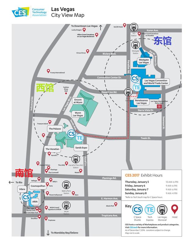 今年CES总共有3大展馆,分别为东、西、南三馆。东馆展出的产品主要为: 网络和个人安全产品、无人机、自驾技术、游戏、AR、VR等。西馆展出的主要产品为: 3D打印、教育、健康、健身技术、智能家居的发展。南馆展出的主要产品会议、分享、路演中心。