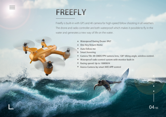 穿越机、防水穿越无人机:Freefly,中文名‘自由者’,两款产品均出自同一设计平台,外观几乎一致。