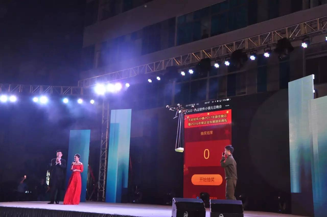 在颁奖环节,全球鹰飞行学院的师生用无人机把本次晚会最神秘的奖项从夜空中成功送到领奖台。现场很火爆!。