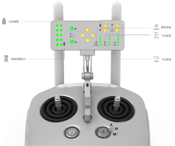 标配为喷洒作业定制的遥控器,能实现超远距离实时通信控制。防尘和防泼溅设计使其能适应恶劣的作业环境。遥控器配备独特的作业状态显示板,能直观地反馈实时作业信息和飞行信息。