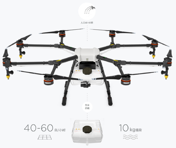 配备强劲的八轴动力系统,大疆MG-1标准载荷达10公斤。每小时作业量可达40-60亩,作业效率是人工的40-60倍。