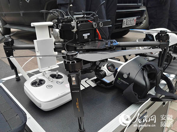 活动中,合肥市公安局特警支队警用无人机的亮相,也吸引了很多人的目光。其中一架无人机,配备了第一视角追踪系统,带上配套的VR眼镜,人们就可以用眼睛控制镜头,通过无人机从空中观察地面情况。