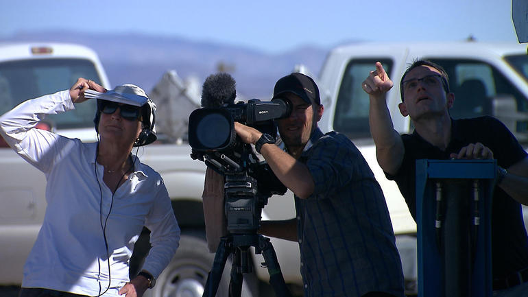 《60分钟时事》的记者们正在搭建摄像设备准备抓拍“蜂群无人机”。