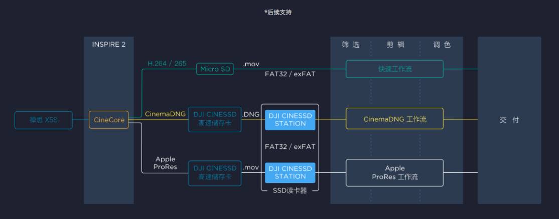 “悟”Inspire 2的影像处理系统可谓是大升级,首先能支持更好画质和更高码率的拍摄。内置的全新图像处理系统CineCore2.0支持各种视频压缩格式,最高可录制5.2K CinemaDNG和 Apple ProRes视频和高达100Mbps码率的H.265和H.264编码视频。全新的工作流也大大提升了处理效率,可以直接使用影视行业常用的后期处理软件进行处理。支持exFAT*或FAT32标准文件系统,无需额外软件,通过 DJI CINESSD 读卡器即可直接读出素材。这为电视台的专业摄像用户带来了很大的便利,飞行器拍摄的画面不再需要转码。