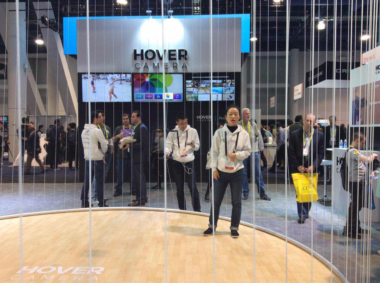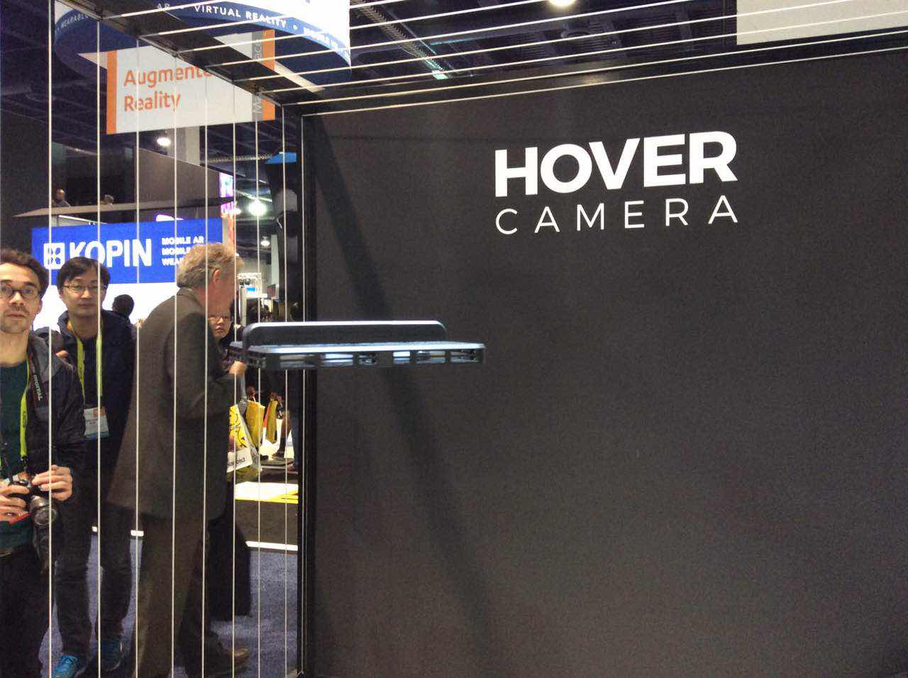 HOVER CAMERA在拉斯维加斯CES的展台设计,是以线圈围成一个大圆,将无人機展示於舞台中央。对面的萤幕,能够看见无线连网的无人机是如何自动识别人脸,智能地进行人物追踪并执行摄影;而最右方的屏幕,则以十六宫格展示过往玩家的录相作品。亮眼的展台设计,吸引了许多人到场一睹风采。