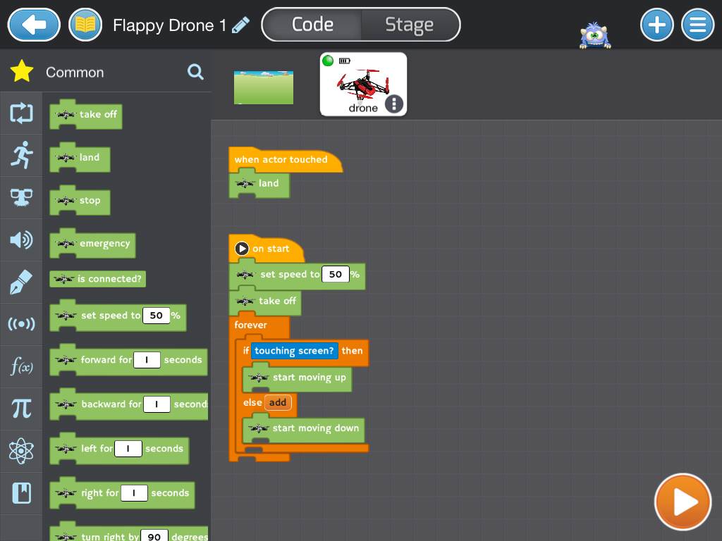 比如“Flappy Drone”,孩子们可以通过编写代码来让 Parrot Rolling Spider 像“Flappy Bird”游戏中的那只鸟一样,在现实环境中实现上下飞行避障的控制。