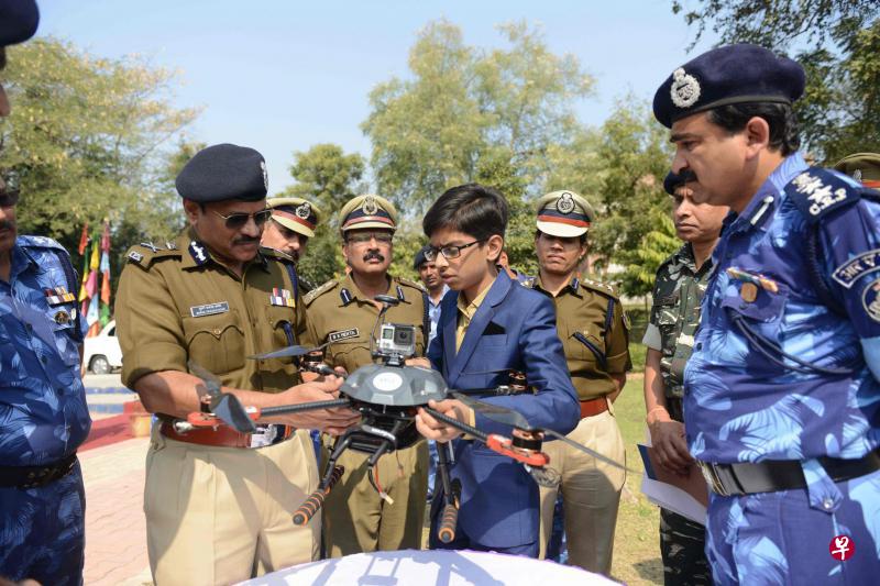 印度14岁少年扎拉(Harshwardhan Zala)自小对科技充满兴趣,他在阅读到地雷造成军人高伤亡率的报告后,发奋研发一部可扫描探测地雷的无人机原型,让使用者可在一个安全距离侦测地雷。据报道,用者形容这无人机“比所有扫雷工具都有效”。扎拉最近和印度政府签下一纸价值5000万卢比(约104万5000新元)的合约,继续研发相关技术及大量生产的可能。图为扎拉(中)向印度警察部队展示他研发的无人机。