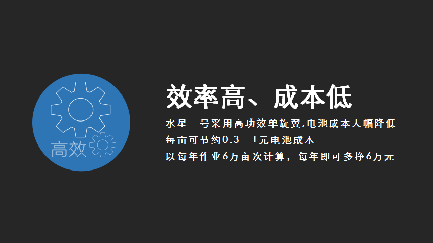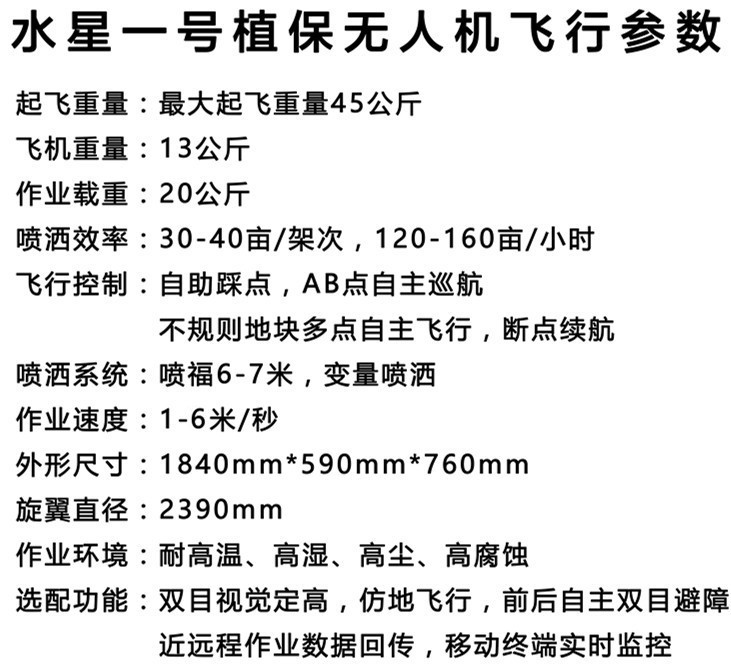 这款载重20公斤的电动植保无人机,一经推向市场就引起了行业和用户的极大关注。作为中国植保无人机行业标杆性的企业,汉和航空从用户角度出发重新定义第三代植保无人机。水星一号,是典型的“能干活、能赚钱”的第三代植保无人机代表机型,汉和航空投入大量人力、物力、财力,经历了长达14个月的研发,共计近万余次的测试飞行,6次整机迭代、100余次核心部件迭代,最终为行业与用户带来了适合中国农业的植保无人机。
