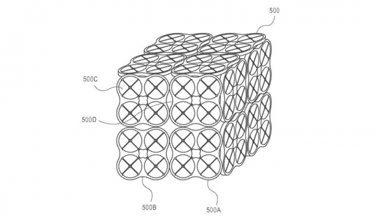 这项新专利用一群小无人机做一个无人机集群,组成一个巨型的运输无人机,来完善亚马逊自身的无人机物流方案。从曝光的专利技术图来看,亚马逊这个“巨型运输机”集群所使用的无人机是一种小型的四轴无人机,无人机桨翼四轴都被边框包裹,单个小无人机可以在载重10磅(约4.5公斤)的情况下连续飞行30分钟。