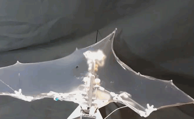 Bat Bot有9个连接点,从头到尾长度不到8英寸(约20厘米)。无人机机翼很薄,铺开之后大约1.5英尺长(约45.7厘米)。翅膀每秒扇10次。