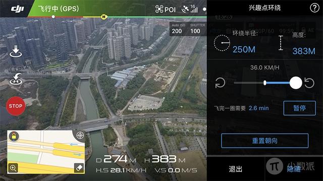 兴趣点环绕,就是指让无人机在空中飞出一个「圆」。像我们使用圆规画圆一样,无人机在指定高度并记录中心点,随后将无人机向后倒飞划出环绕半径,启动功能后即可保持摄像头指向中心点进行环绕飞行。