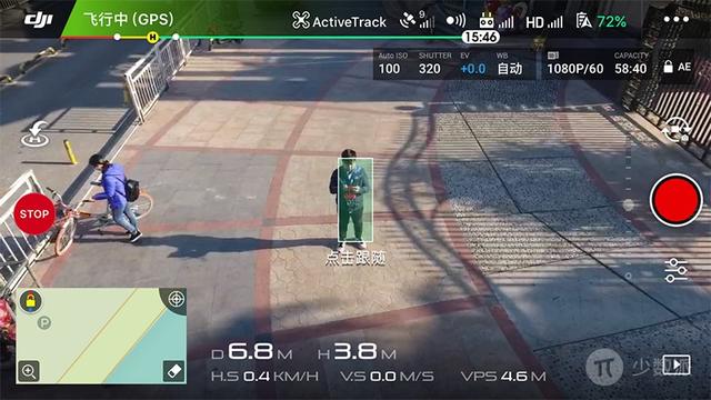 选择智能跟随模式,在画面内框选拍摄对象之后,无人机会智能识别进行跟随拍摄。不管拍摄对象如何移动,无人机和云台相机会让拍摄对象锁定在画面中可见,此时你只需要看 Phantom 4 如何帮你拍摄就可以了。