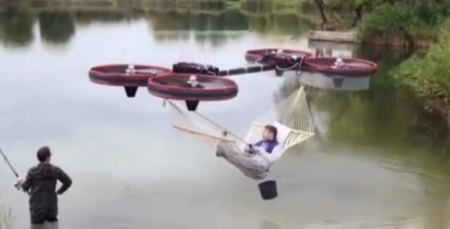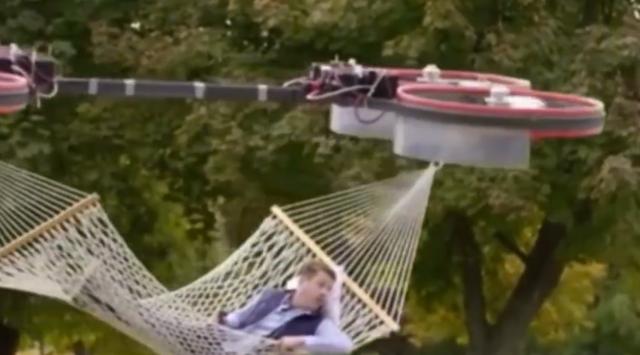 这位奇葩的美国人,自己拼装出了一个超大的无人机,然后下面拉着吊床,自己躺着吊床上,就可以飞出去遛弯了!