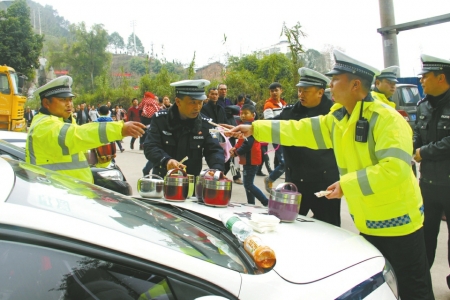 全员出动 交警路边吃盒饭坚守岗位