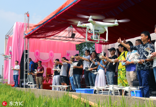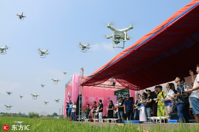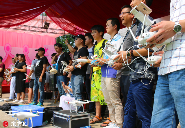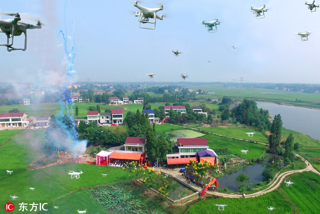 2016年9月19日,湖南省益阳市赫山区泉交河镇,数十架无人遥控飞机在空中盘旋。据了解,这天是徐亚军的千金满月的日子。为庆祝自己喜添千金,徐亚军在“...