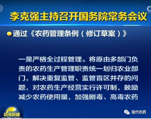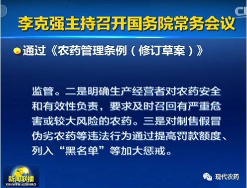 2月8日,李克强总理主持召开国务院常务会议。会议通过《农药管理条例(修订草案)》,草案围绕保障农产品质量安全: