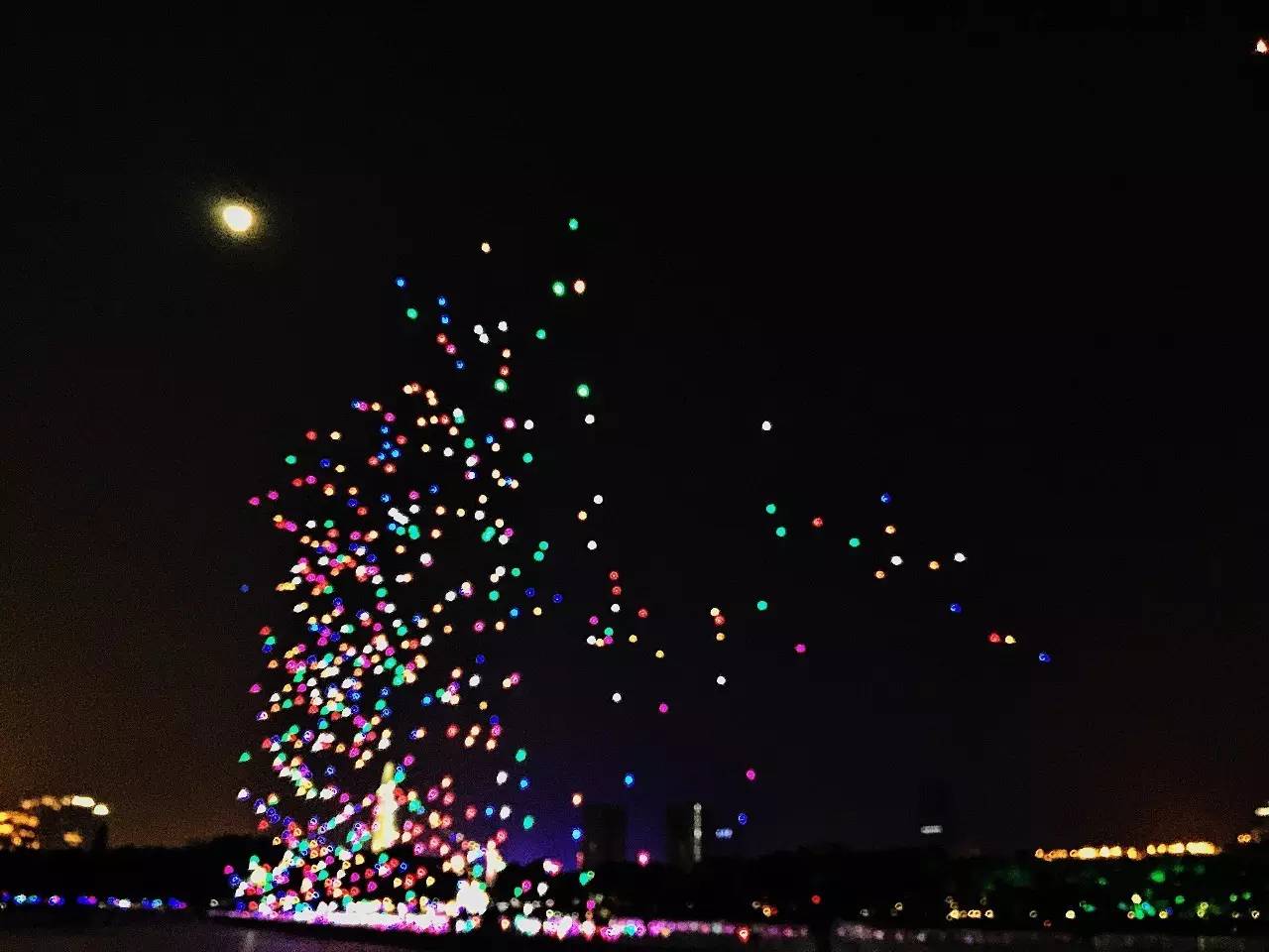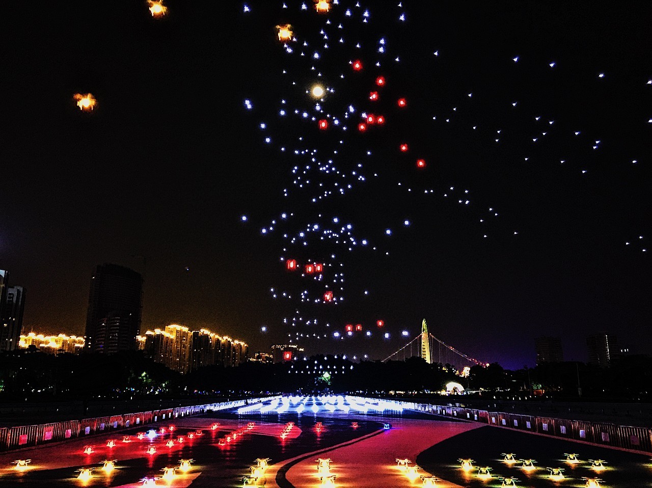 对讲机中铿锵的倒计时声音刚落,国人原创的著名交响乐《黄河·第三乐章》便适时响起,千架无人机亦开始冉冉升起。