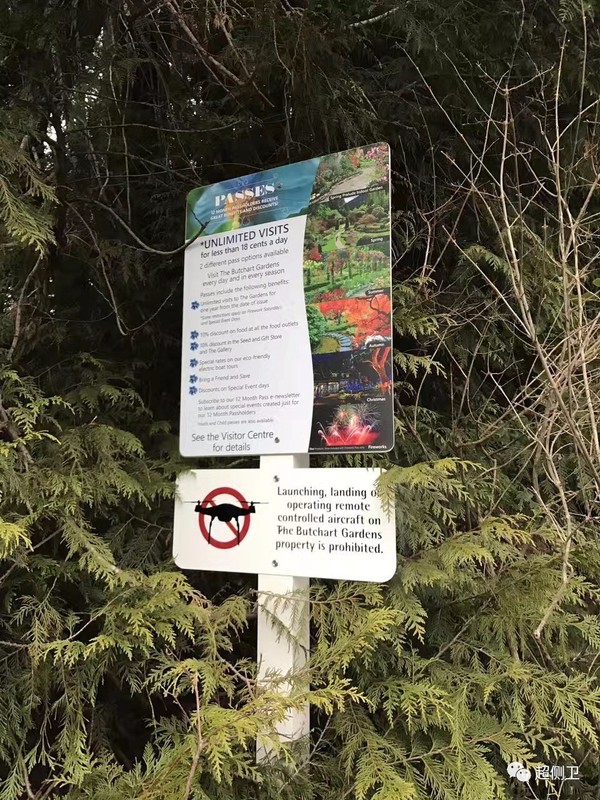 此外,在一些私人领地也会有相应的提示,比如上图就是在加拿大维多利亚市的布查特花园明确标示不允许使用无人机?