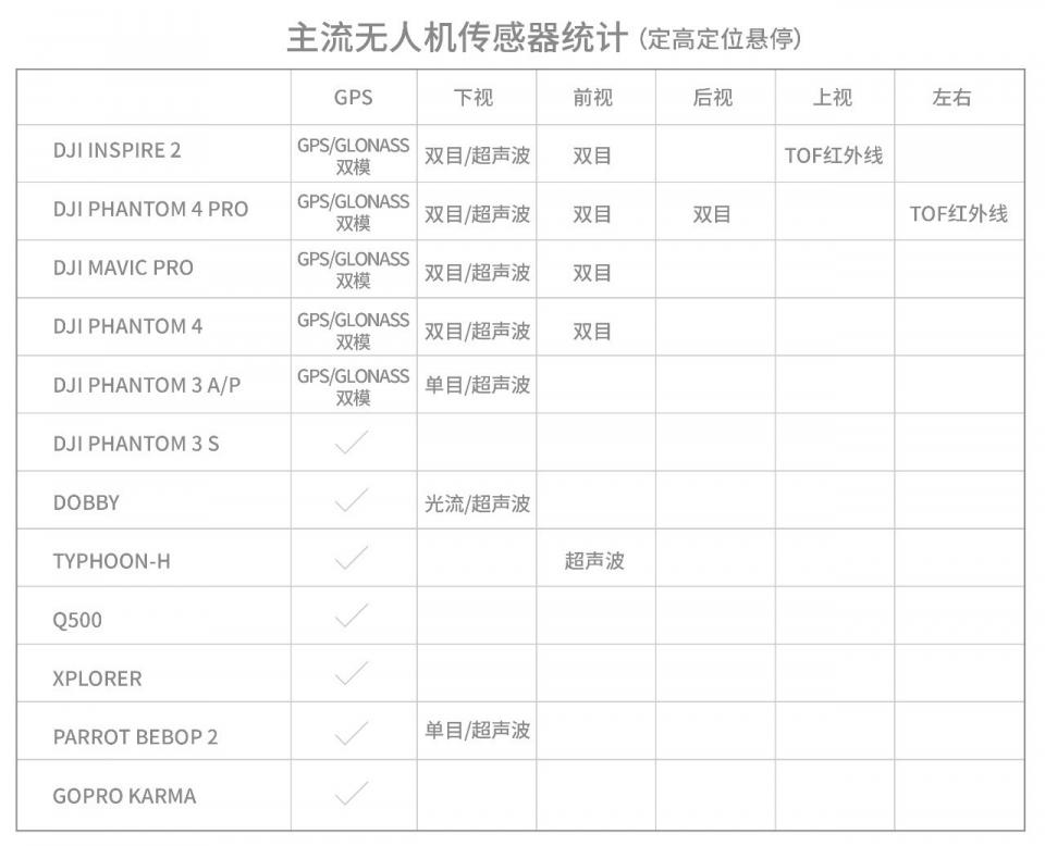 特地梳理一下市面上主流无人机悬停技术相关的硬件信息: