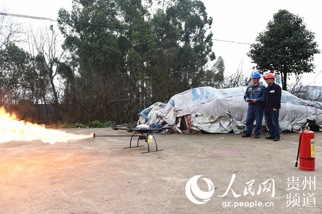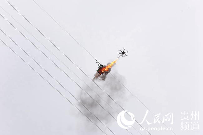 图为:无人机携带喷火枪对线路障碍物进行烧毁消除。